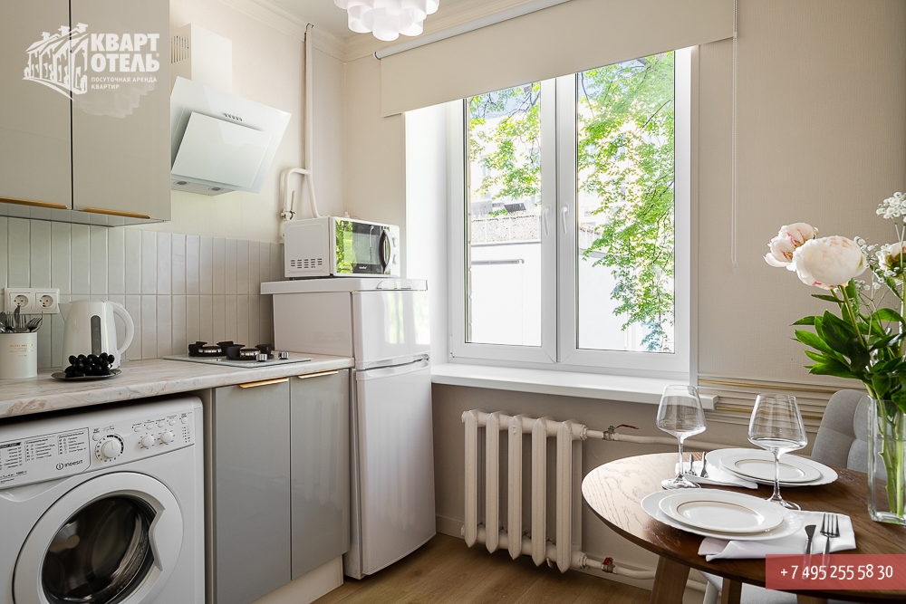 The apartment is equipped with everything you might need for a comfortable stay, including tea, sugar, umbrella, city directory, shampoo, soap and other consumables. A full set of bed linen of high-quality white sateen and white terry towels are also provided