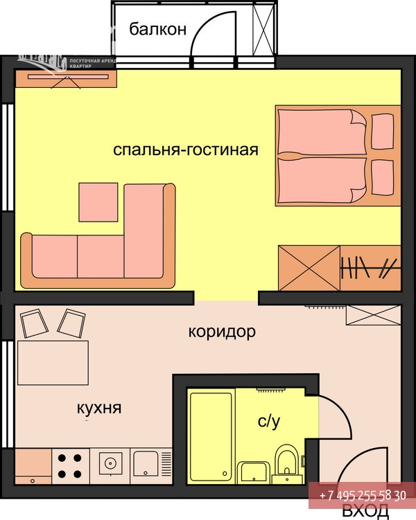 Book this apartment you can in the service of booking by phone +7 (495) 255 58 30 on weekdays from 9 am to 20 pm, on weekends and holidays from 10 to 18 hours. Payment is possible by bank transfer to our bank account, cash in the office or on arrival at the apartment, payment cards VISA, MasterCard, wire transfer in the system Yandex-Money. For more information on booking and payment methods can be obtained from the section Services and Payment and discounts.