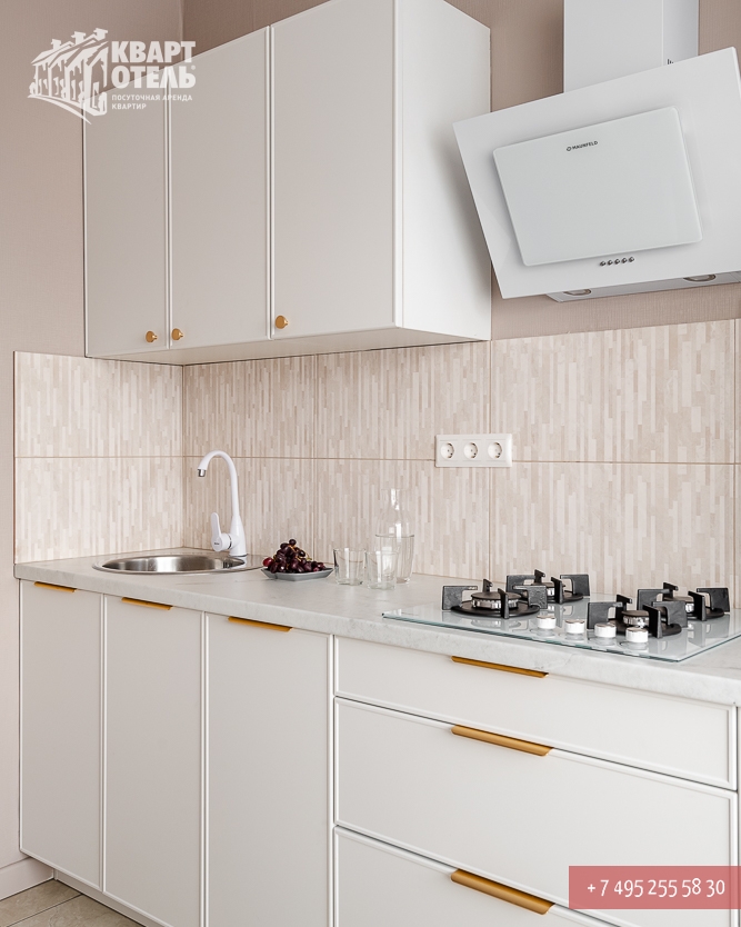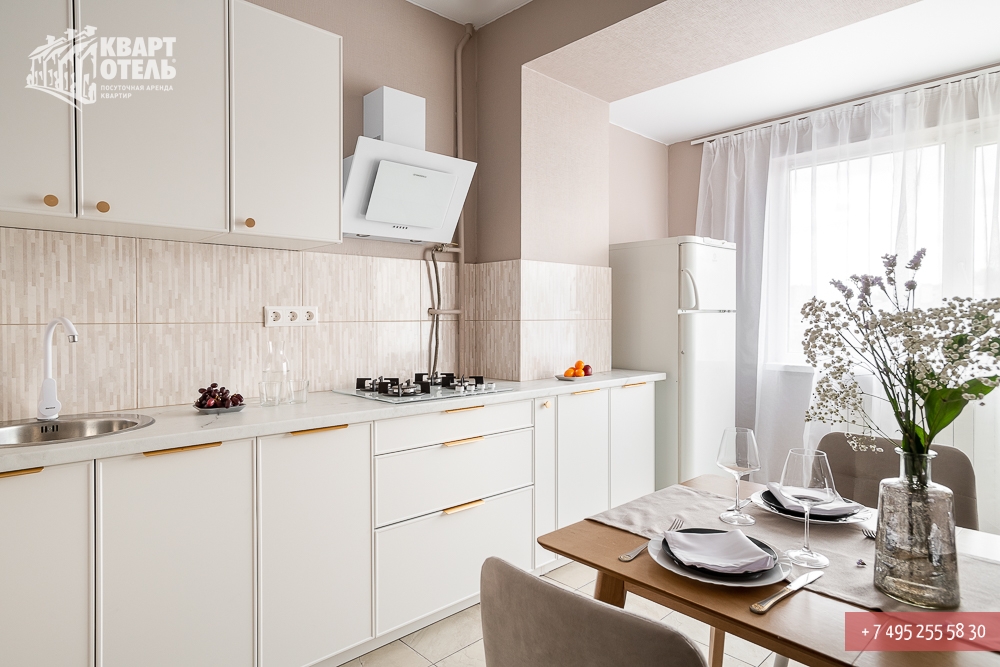 The apartment is equipped with everything you might need for a comfortable stay, including tea, sugar, umbrella, city directory, shampoo, soap and other consumables. A full set of bed linen of high-quality white sateen and white terry towels are also provided