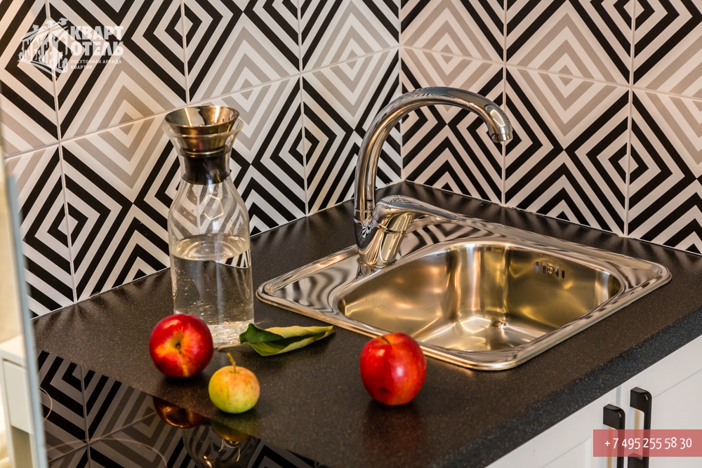 The apartment is equipped with everything you might need for a comfortable stay, including tea, sugar, umbrella, city directory, shampoo, soap and other consumables. A full set of bed linen of high-quality white sateen and white terry towels are also provided