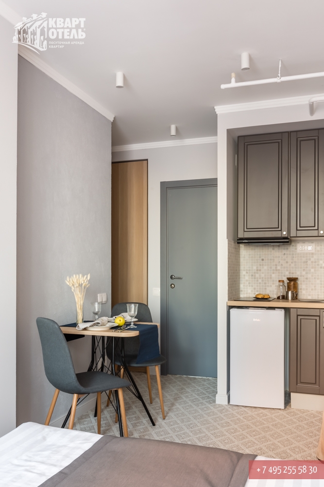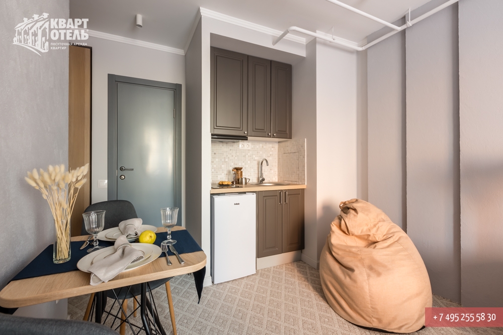 The apartment is equipped with everything you might need for a comfortable stay, including tea, sugar, umbrella, city directory, shampoo, soap and other consumables. A full set of bed linen of high-quality white sateen and white terry towels are also provided