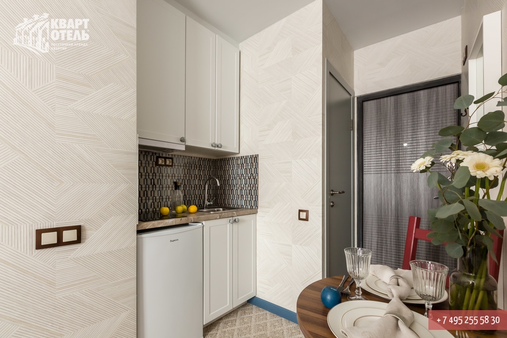 The apartment is equipped with everything you might need for a comfortable stay, including tea, sugar, umbrella, city directory, shampoo, soap and other consumables. A full set of bed linen of high-quality white sateen and white terry towels are also provided