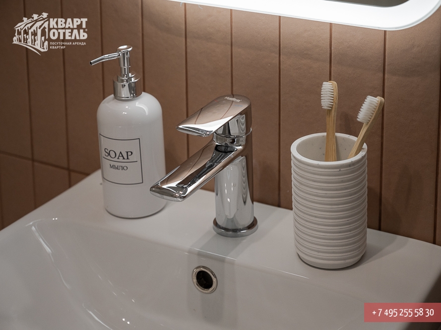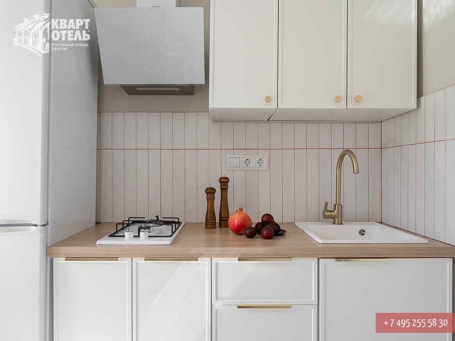 The apartment is equipped with everything you might need for a comfortable stay, including tea, sugar, umbrella, city directory, shampoo, soap and other consumables. A full set of bed linen of high-quality white sateen and white terry towels are also provided