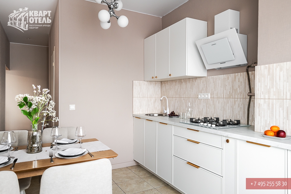 The apartment is equipped with everything you might need for a comfortable stay, including tea, sugar, umbrella, city directory, shampoo, soap and other consumables. A full set of bed linen of high-quality white sateen and white terry towels are also provided