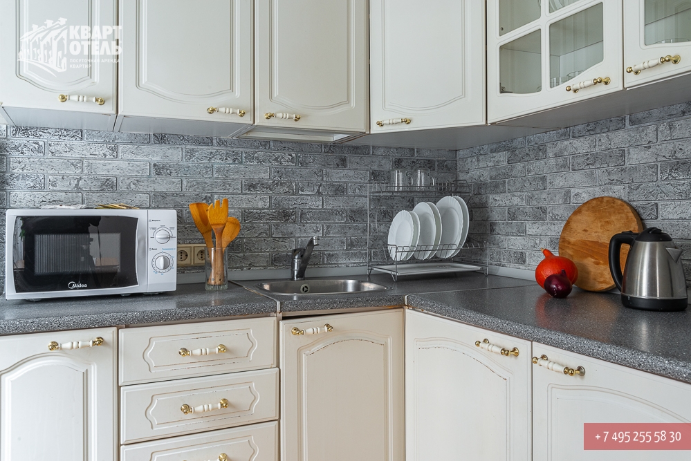 The apartment is equipped with everything you might need for a comfortable stay, including tea, sugar, umbrella, city directory, shampoo, soap and other consumables. A full set of bed linen of high-quality white sateen and white terry towels are also provided