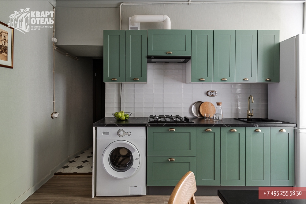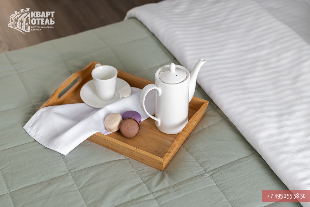 The apartment is equipped with everything you might need for a comfortable stay, including tea, sugar, umbrella, city directory, shampoo, soap and other consumables. A full set of bed linen of high-quality white sateen and white terry towels are also provided