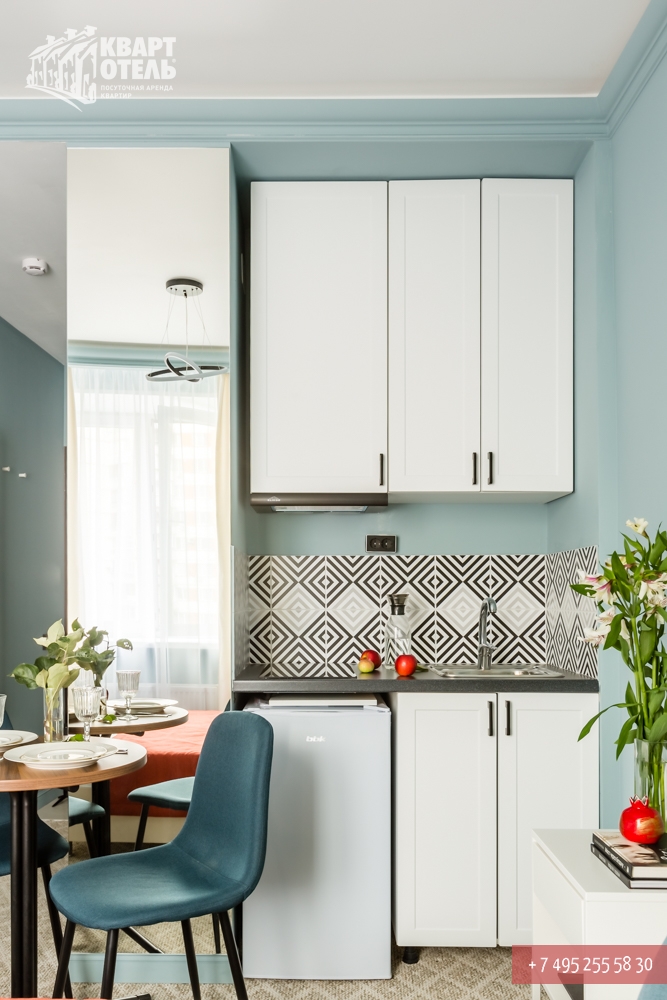 The apartment is equipped with everything you might need for a comfortable stay, including tea, sugar, umbrella, city directory, shampoo, soap and other consumables. A full set of bed linen of high-quality white sateen and white terry towels are also provided
