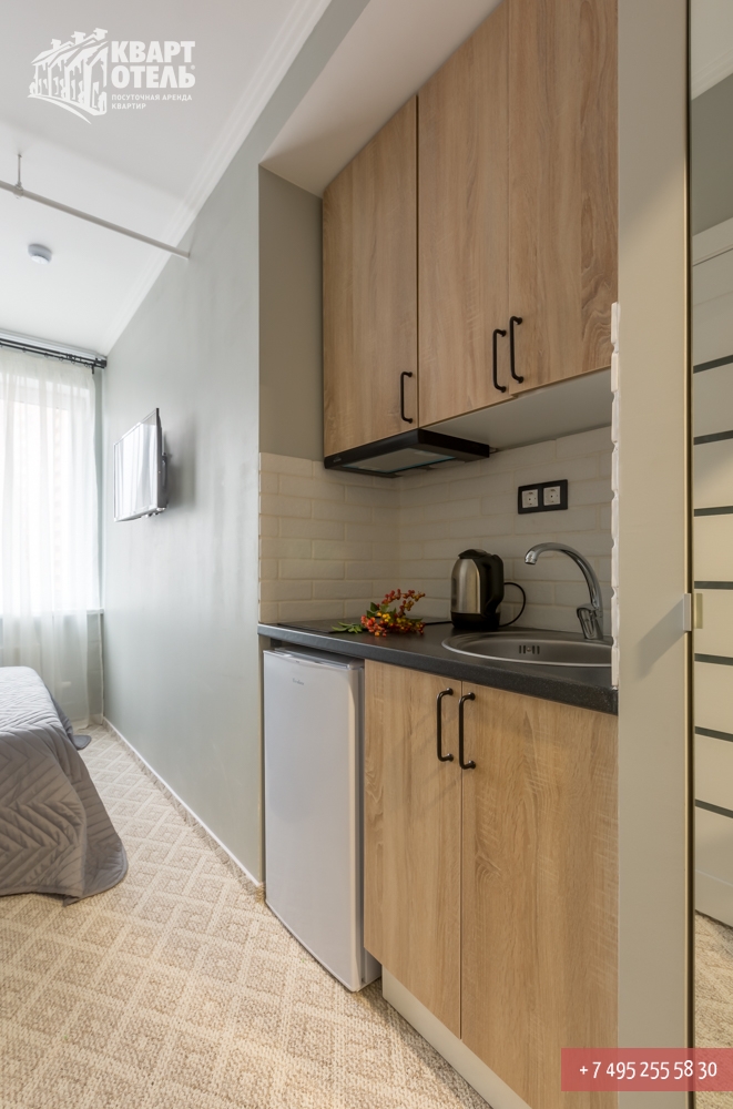 The apartment is equipped with everything you might need for a comfortable stay, including tea, sugar, umbrella, city directory, shampoo, soap and other consumables. A full set of bed linen of high-quality white sateen and white terry towels are also provided