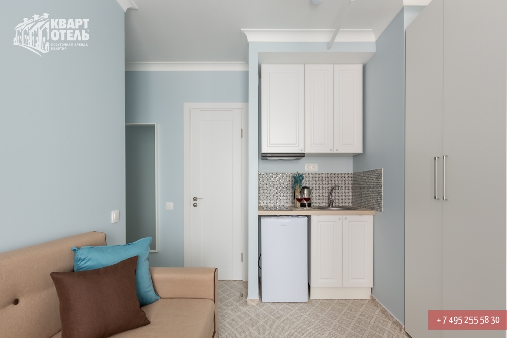 The apartment is equipped with everything you might need for a comfortable stay, including tea, sugar, umbrella, city directory, shampoo, soap and other consumables. A full set of bed linen of high-quality white sateen and white terry towels are also provided