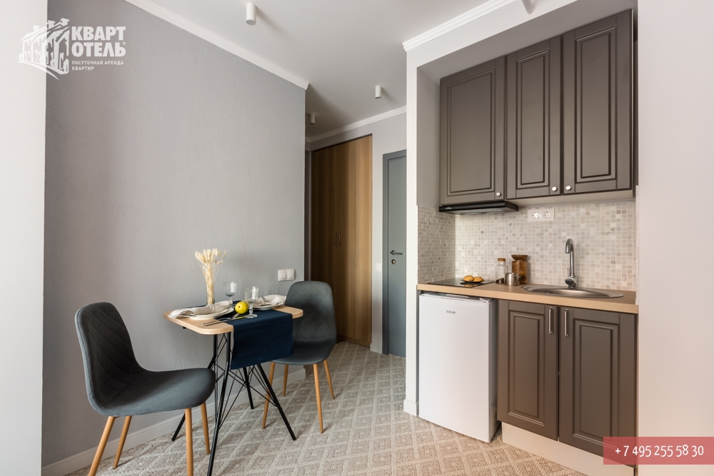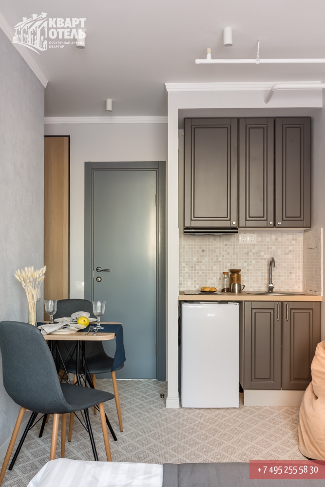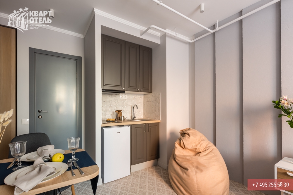 The apartment is equipped with everything you might need for a comfortable stay, including tea, sugar, umbrella, city directory, shampoo, soap and other consumables. A full set of bed linen of high-quality white sateen and white terry towels are also provided