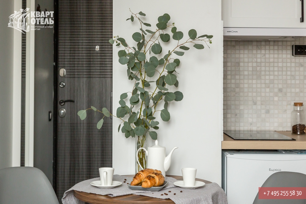 The apartment is equipped with everything you might need for a comfortable stay, including tea, sugar, umbrella, city directory, shampoo, soap and other consumables. A full set of bed linen of high-quality white sateen and white terry towels are also provided
