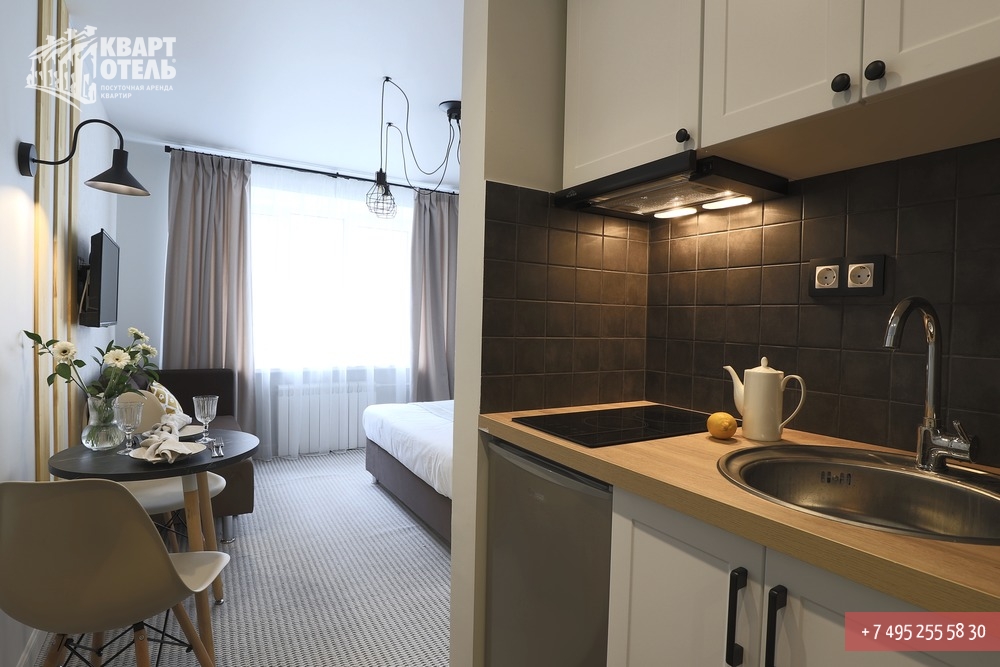 The apartment is equipped with everything you might need for a comfortable stay, including tea, sugar, umbrella, city directory, shampoo, soap and other consumables. A full set of bed linen of high-quality white sateen and white terry towels are also provided
