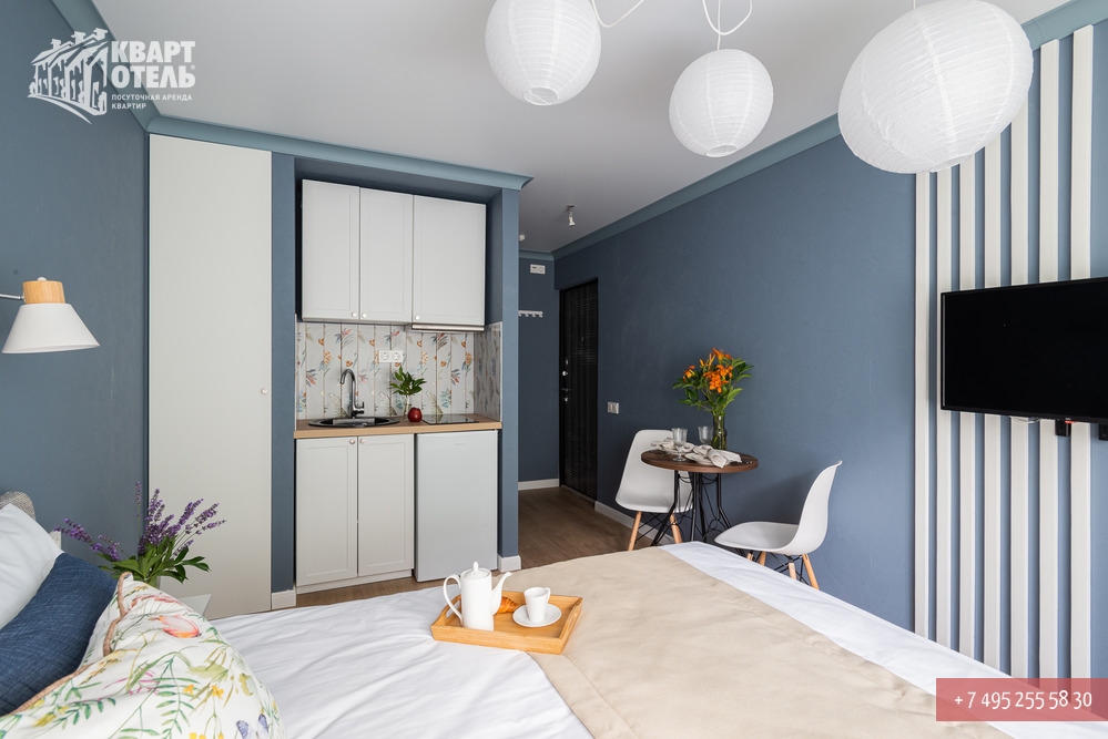 The apartment is equipped with everything you might need for a comfortable stay, including tea, sugar, umbrella, city directory, shampoo, soap and other consumables. A full set of bed linen of high-quality white sateen and white terry towels are also provided